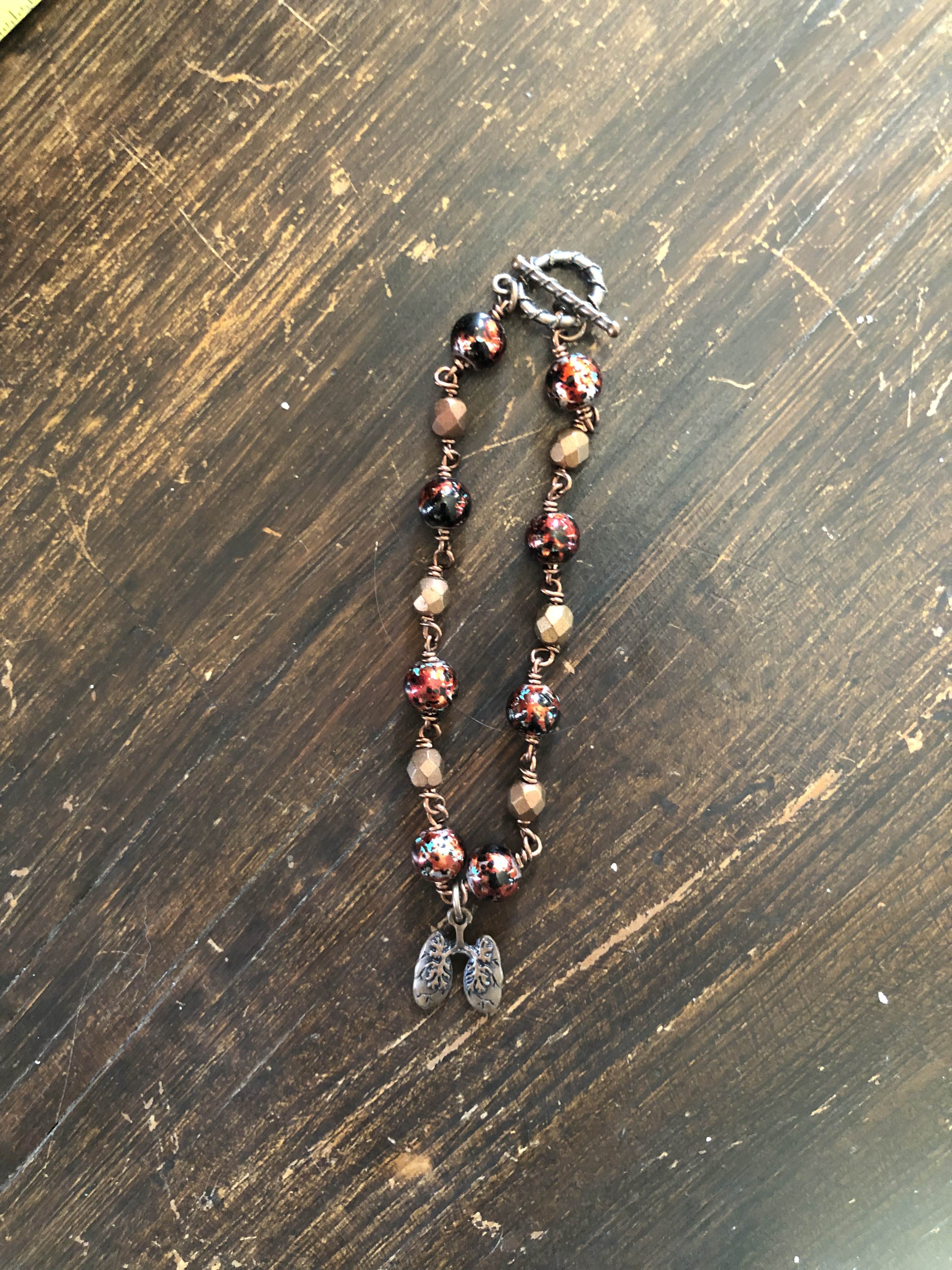 I used dark copper wire, dark copper colored metal lungs charm, red mixed with black splatter beads, and copper colored faceted Czech glass beads.