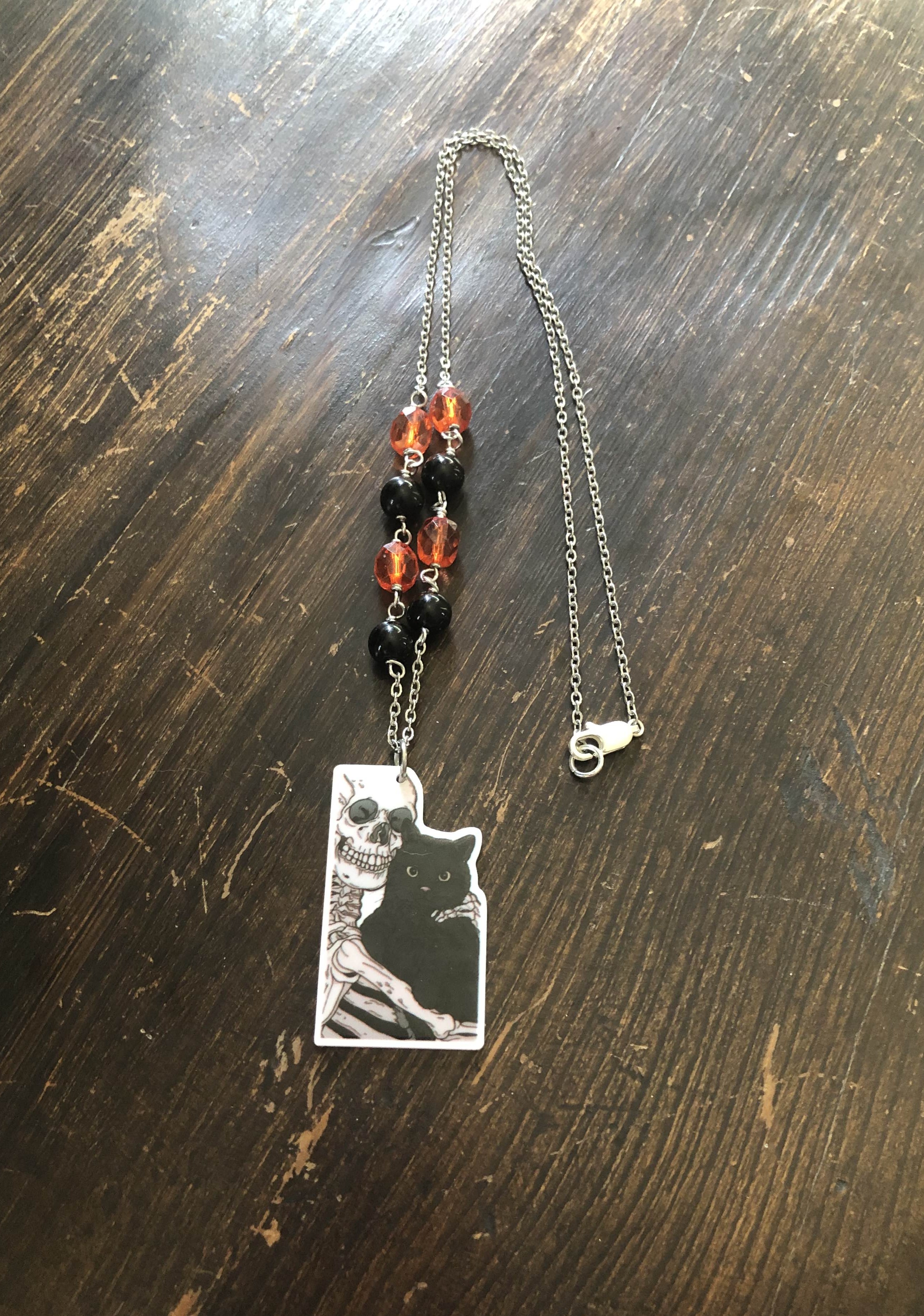 In 2023, my mom bought this pendant for me but I decided to wait for the following year to do something with it. I now have gotten around to making this necklace with plastic black and orange beads I have.