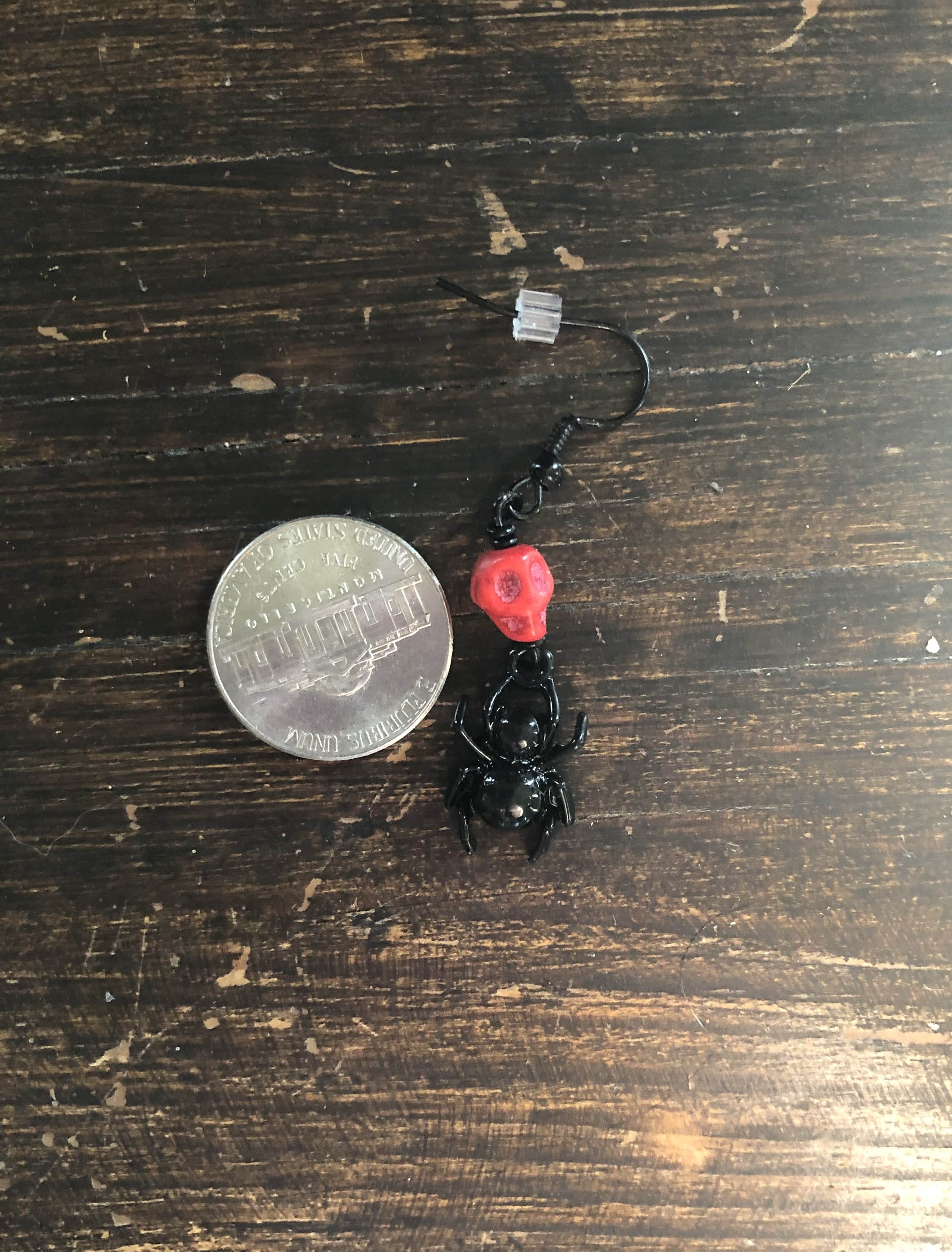 These earrings were made with black colored metal spider charms wire wrapped to dyed red howlite skull beads. I chose red skulls specifically to evoke the imagery of black widows.