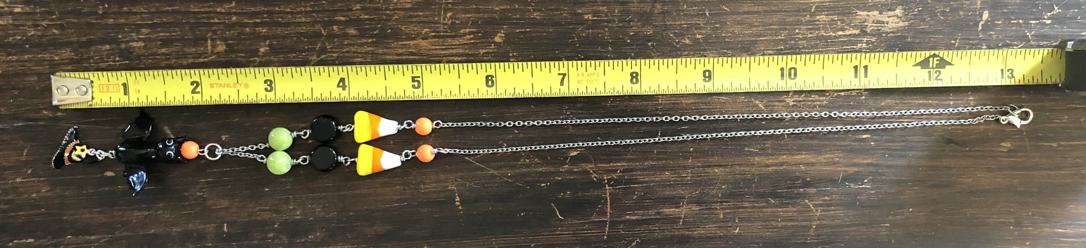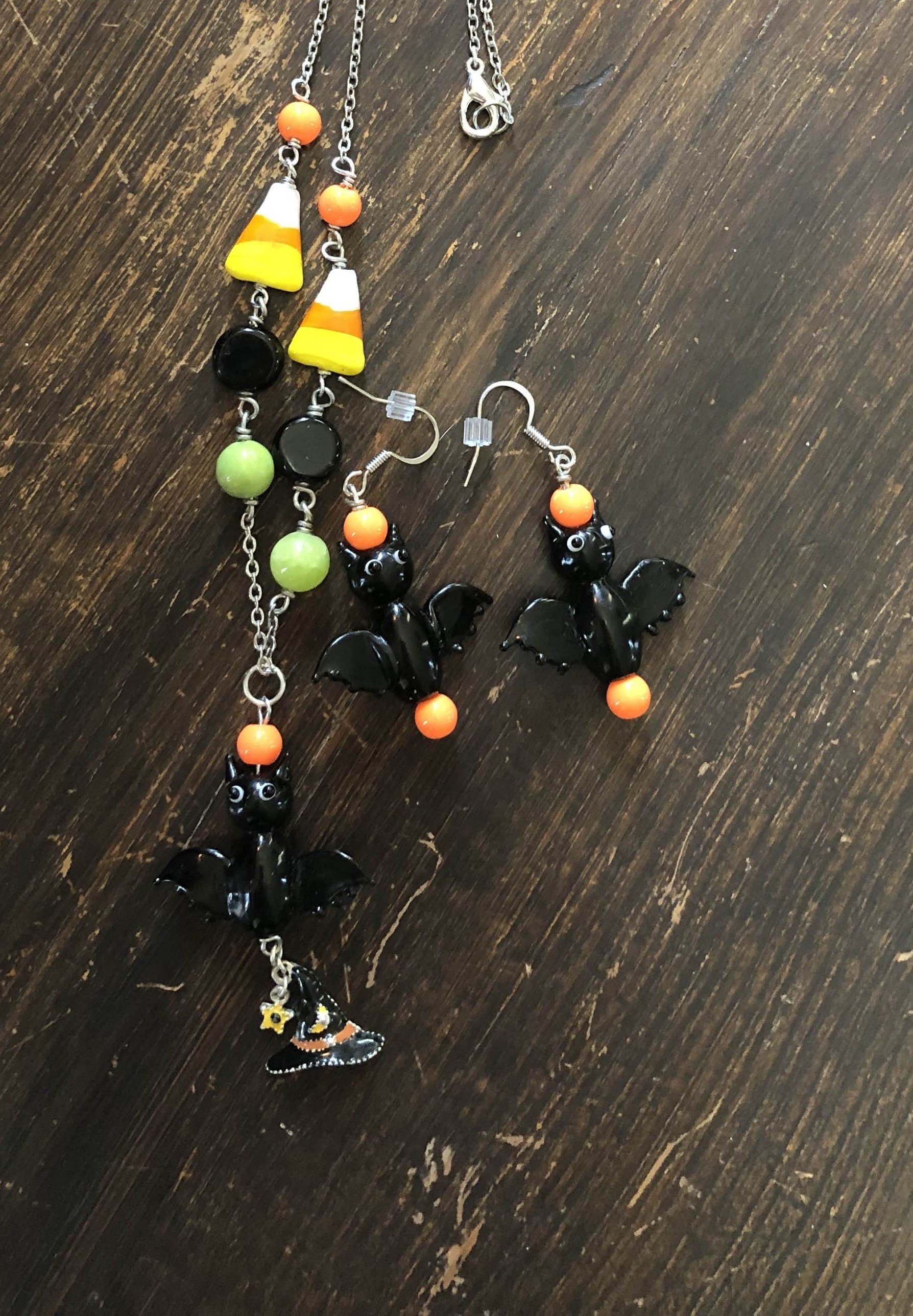 For the necklace I wire wrapped a witch hat charm beneath the bat pendant. I used small round orange beads, dyed light green agate beads, black glass beads, and handblown glass candy corn. While the earrings I used the small orange beads and handblown glass bat beads.