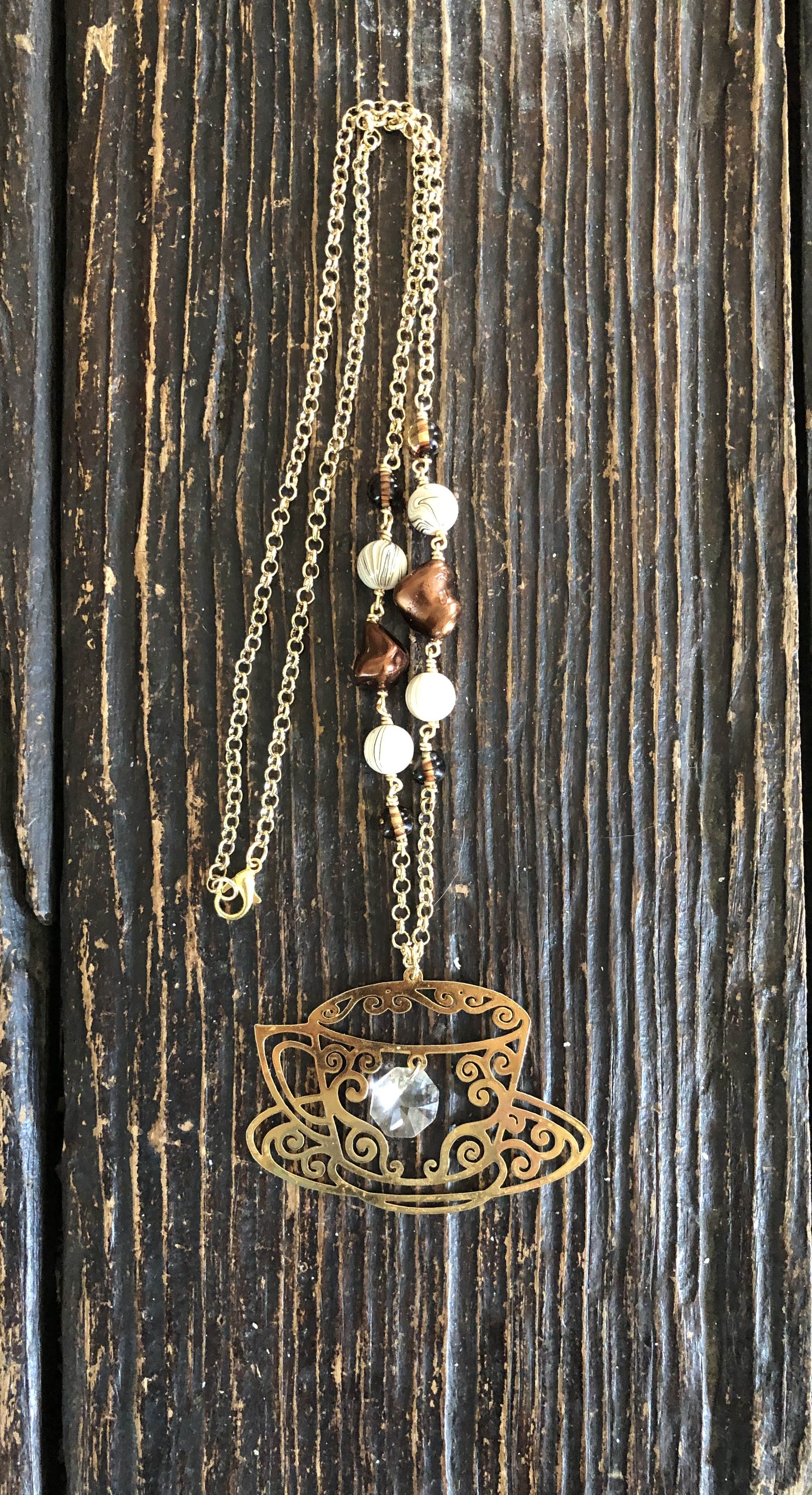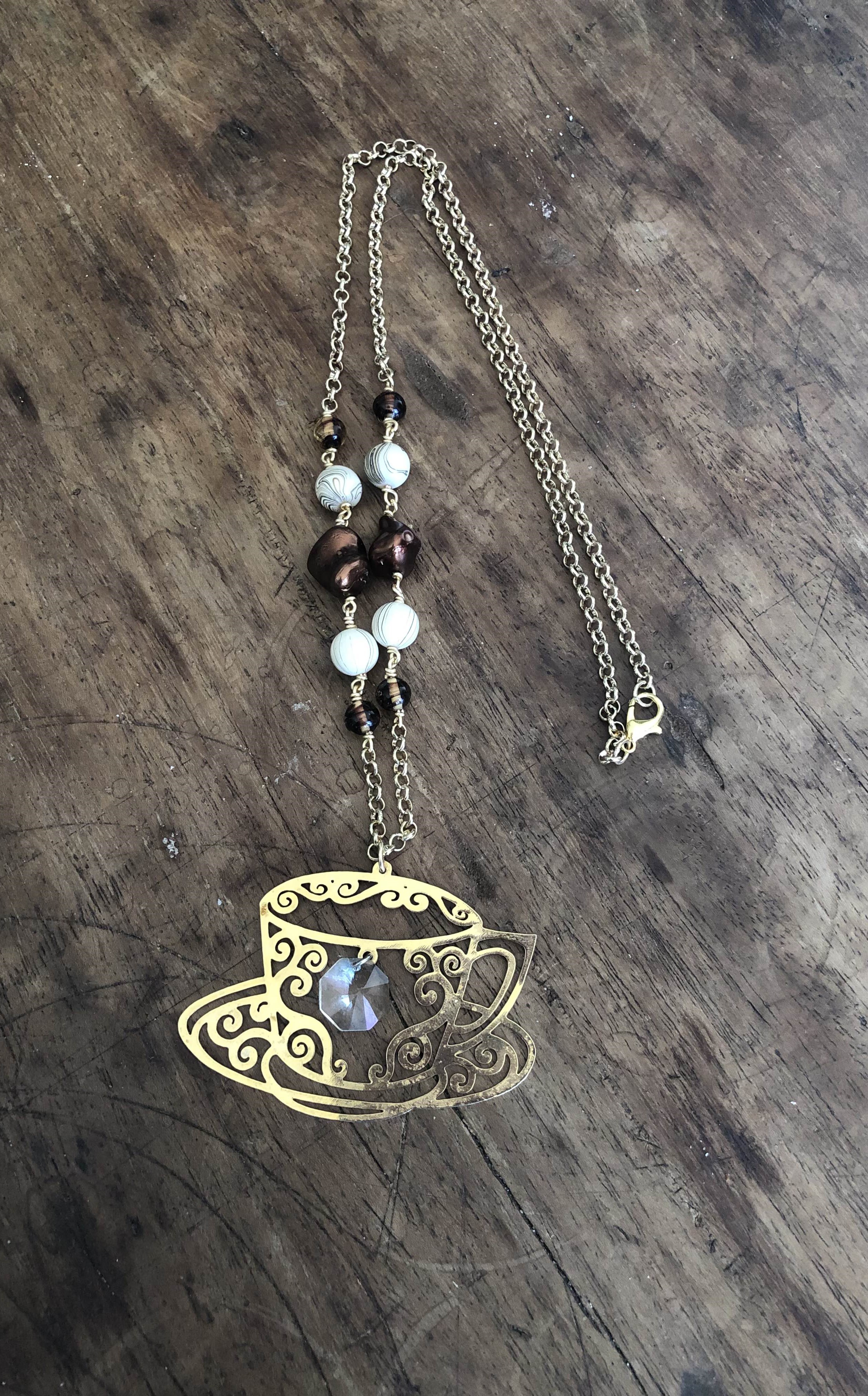 I found this gold colored metal teacup/coffee cup pendant that has a fake crystal inside it from my local antique mall. I thought it would be fun to use round glass brown black beads, white brown round beads, and brown beads on this necklace to incorporate the theme of tea to coffee.