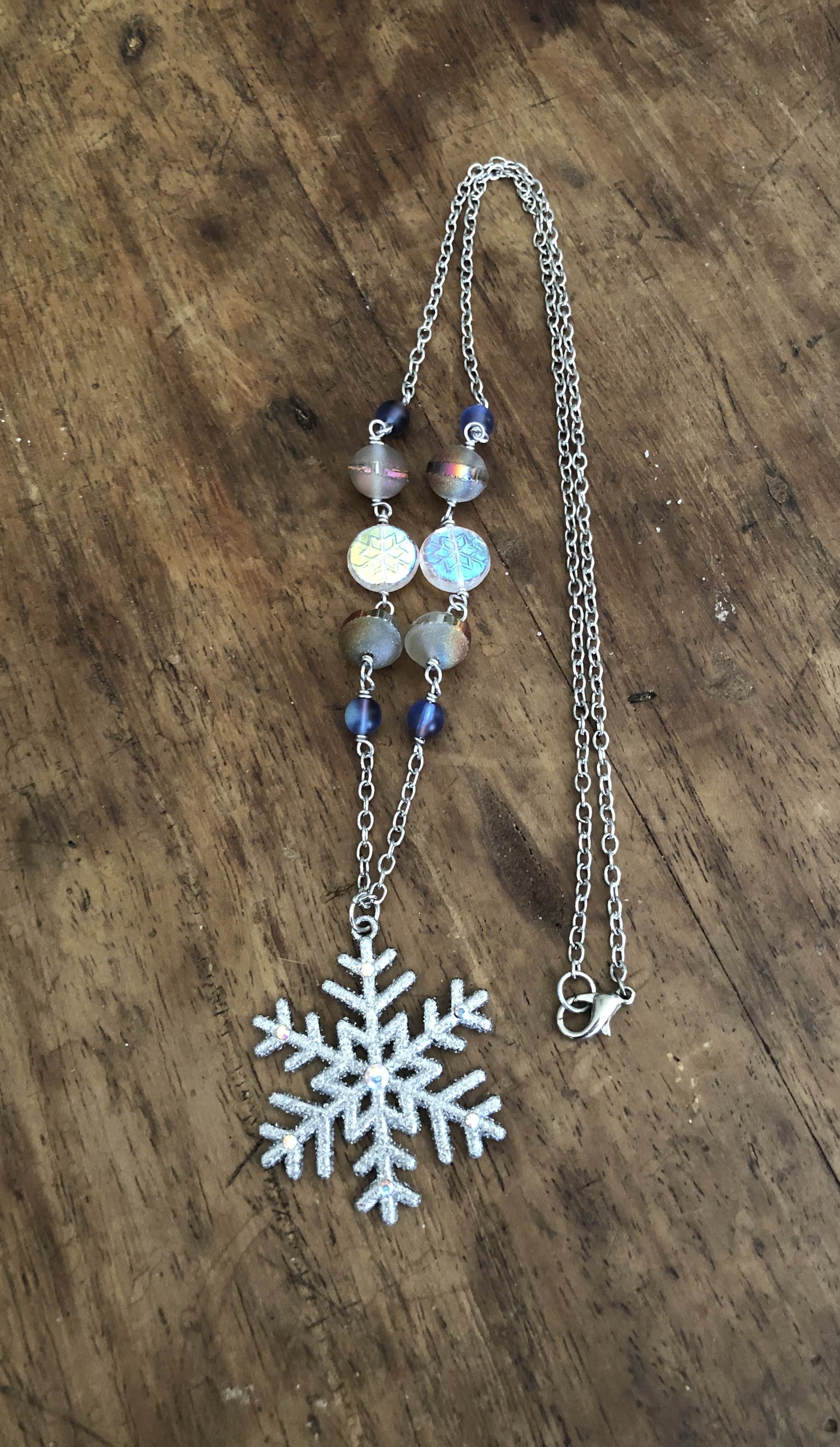 This necklace was made with small round shiny purple glass beads, foggy round glass beads, and shiny semi-translucent snowflake glass beads. The pendant has glitter on it, just to let you know.